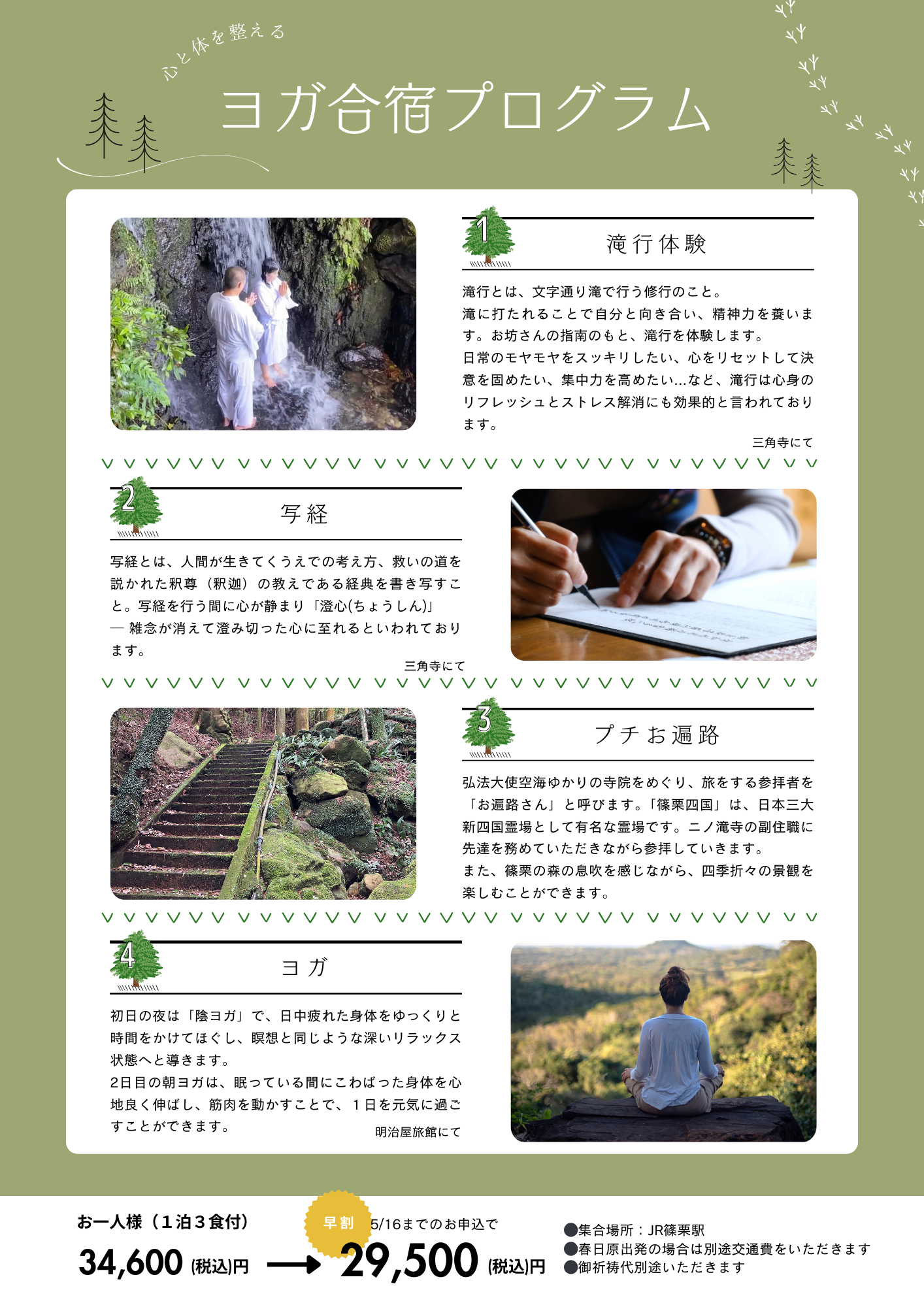滞在期間中の食事代(3食分)、ヨガレッスン代、アクティビティ代、JR篠栗駅〜宿泊施設までの送迎代含む